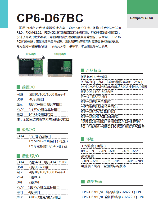 采用Intel® 六代处理器设计方案,, CompactPCI 6U 架构 符合PICMG2.0 R3.0、、、、 PICMG2.16、、PICMG2.3标准和海军标主板标准。。。。具备丰富的外围接口;设计了高效 的散热系统,,,可显著提高处理器的浮点运算性能,,以太网...
