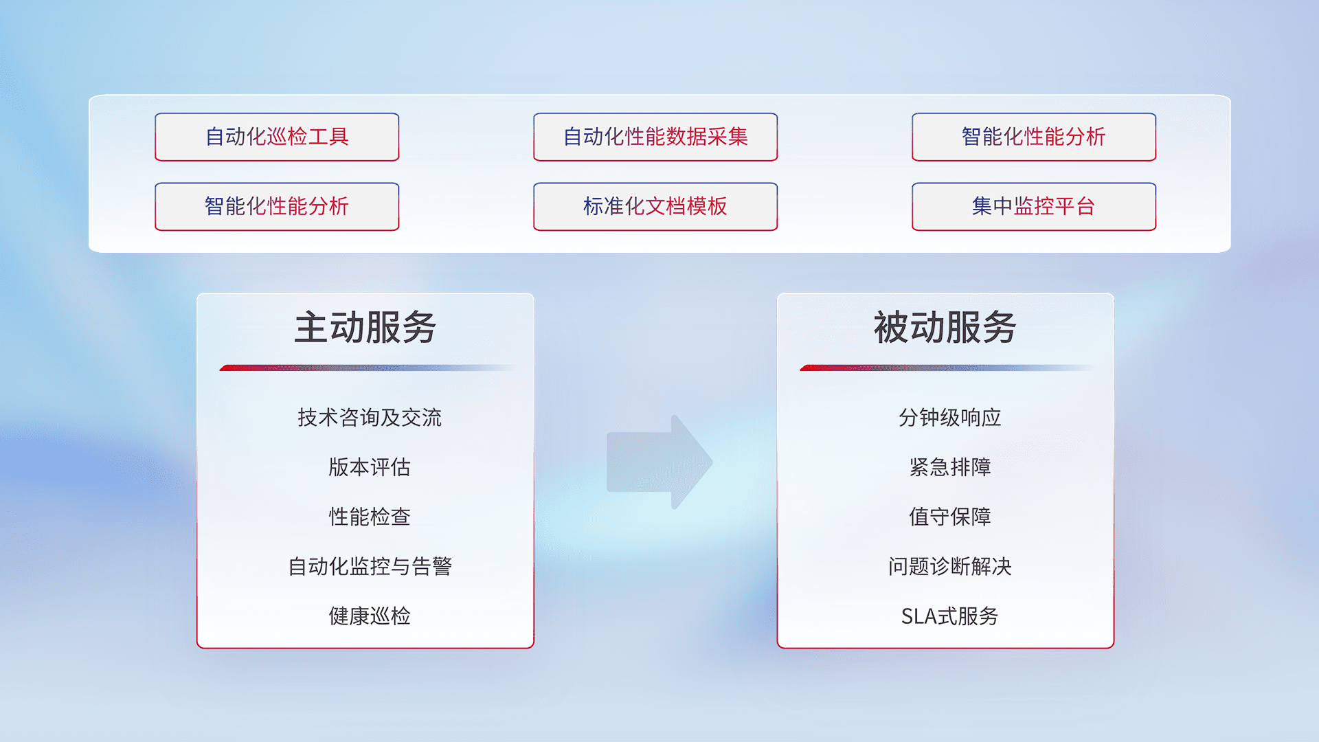 智能化工具和标准化文档,,保障服务质量,,,,提供主动服务(包含技术咨询、、、、版本评估、、、、性能检查、、自动化监控与告警、、健康巡检)和被动服务包含(分钟级响应、、、紧急排障、、、值守保障、、问题诊断解决、、、、SLA服务)。。。。