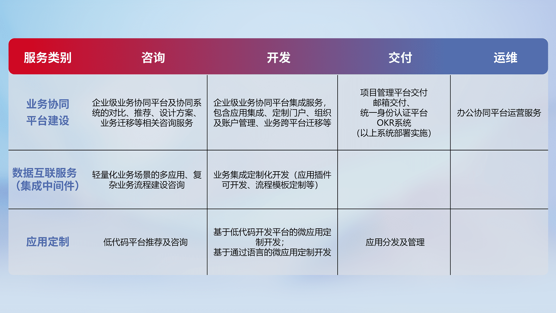 针对钉钉、、、、企微、、、、IDaas等平台级产品提供产品的规划、、、方案、、、、交付、、定制化开发等服务,,,实现如统一协同办公、、智能客户服务、、、混合会议管理、、智能数据查询、、等业务场景,,实现数字化转型。。