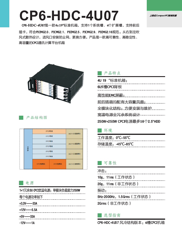 4U 19“标准机箱; 6U5槽CPCI背板 高性能EMC屏蔽; 前后插箱均配有大容量风扇; 全模块化结构;方便安装与维护 宽温电源全冗余系统设计 250W+250W CPCI电源 多10个2.5\"HDD
