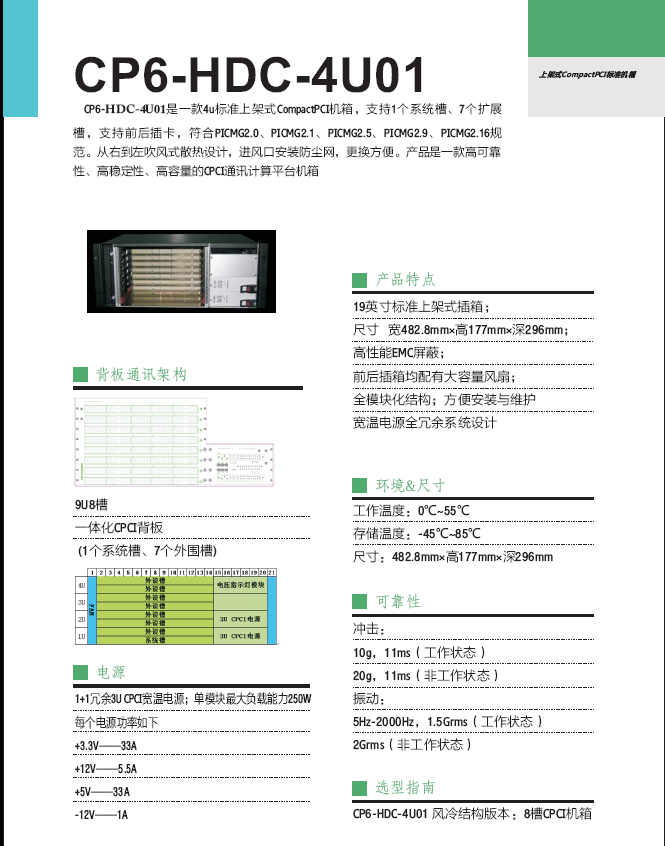 19英寸标准上架式插箱; 尺寸 宽482.8mm×高177mm×深296mm; 全模块化结构;方便安装与维护 宽温电源全冗余系统设计 高性能EMC屏蔽; 前后插箱均配有大容量风扇;