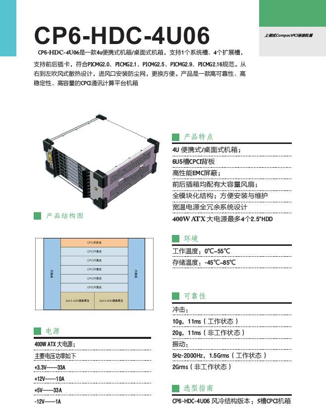 CP6-HDC-4U06是一款4u便携式机箱/桌面式机箱,,,支持1个系统槽、、、、4个扩展槽,,,,支持前后插卡,,符合PICMG2.0、、PICMG2.1、、、PICMG2.5、、、PICMG2.9、、、、PICMG2.16规范。。。。从右到左吹风式散热设计,,,进风口安装防尘网,,,,更换方便。。。产...