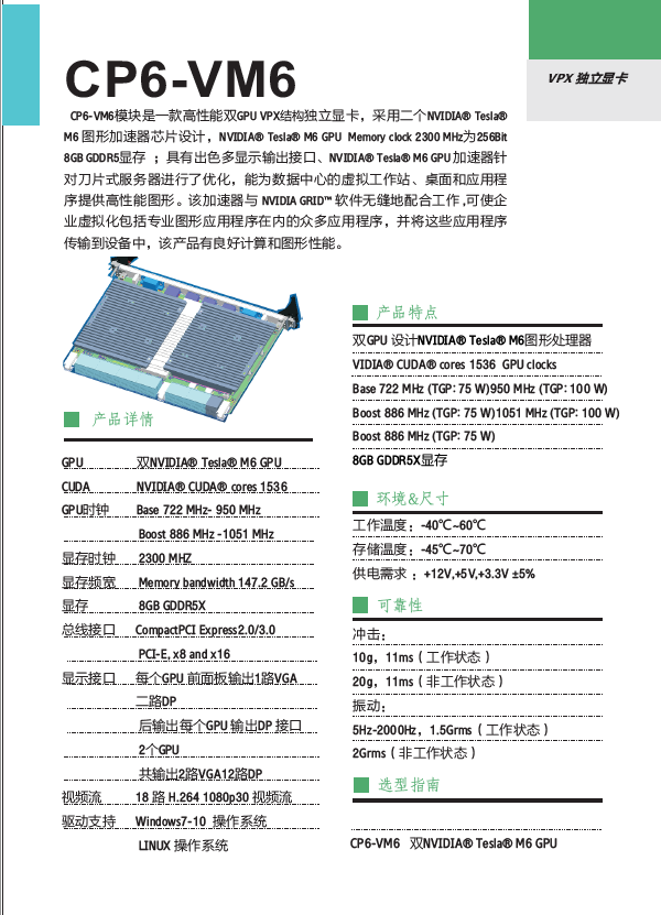 CP6-VM6模块是一款高性能双GPU VPX结构独立显卡,,,,采用二个NVIDIA® Tesla® M6 图形加速器芯片设计,,,NVIDIA®