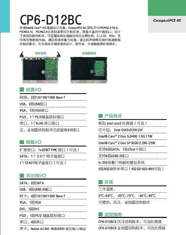 CP6-D12BC 采用Intel® Core™ 2处理器设计方案,,CompactPCI 6U 架构,符合PICMG2.0 R3.0、、、、 PICMG2.16、、、PICMG2.3标准和海军标主板标准。。。具备丰富的外围接口;设计 了高效的散热系统,,可显著提高处理器的浮点运算性能...