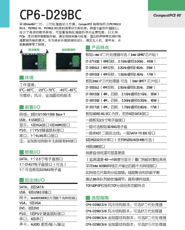 CP6-D29BC采用Intel®i7二代,,,三代处理器设计方案,,,,CompactPCI 6U架构符合PICMG2.0 R3.0、、、、PICMG2.16、、、、PICMG2.3标准和海军标主板标准。。。具备丰富的外围接口; 设计了高效的散热系统,,,可显著提高处理器的浮点运算性能,,...