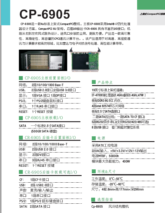 CP-6905是一款4u标准上架式CompactPCI整机,,,主板CP-6905采用Intel® i7四代处理器设计方案,,CompactPCI 6U 架构,,,,后插I/O输出卡CR-6905 具有丰富的I/O接口;机箱从右到左吹风式散热设计,,,进风口安装防尘网,,,更换方...