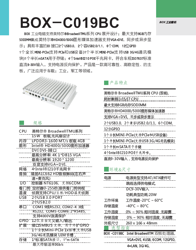 BOX 工业电脑支持英特尔®BroadwellTMU系列 CPU 展开设计; 大支持8GB内存SODIMM集成英特尔®HD4000/5000图形媒体加速器支持VGA+DVI