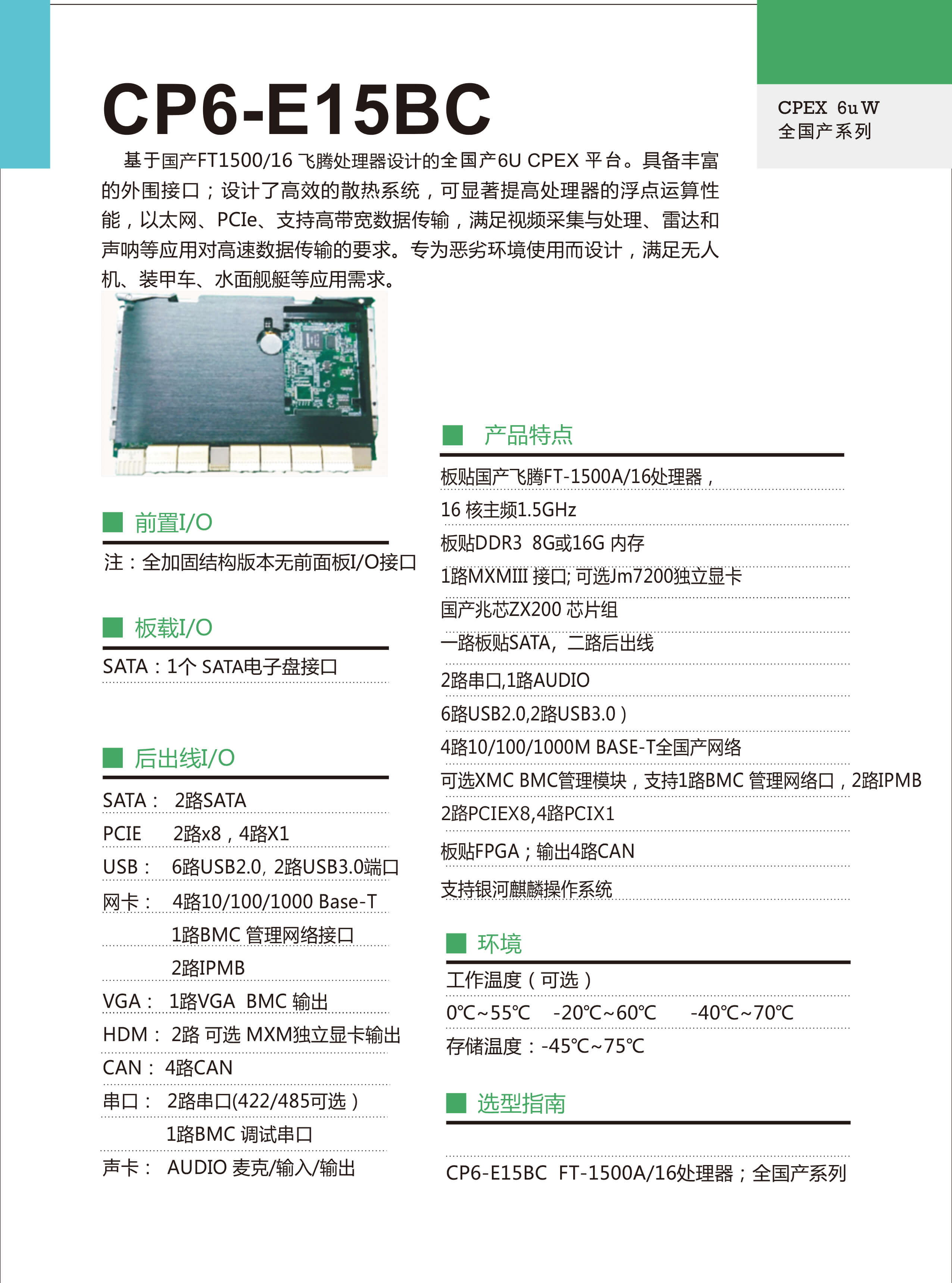 基于国产FT1500/16 飞腾处理器设计的全国产6U CPEX 平台。。。。具备丰富的外围接口;设计了高效的散热系统,,可显著提高处理器的浮点运算性能,,以太网、、、PCIe、、、支持高带宽数据传输,,,,满足视频采集与处理、、、、雷达和声呐等应用对...